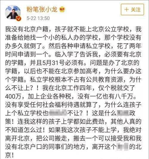 然而现实就是这样,没有北京户口,即便你是上市公司CEO,也照样要接受子女无法上学的事实。粉笔CEO张小龙就遇到了这个问题,并且一度在微博上强烈吐槽:仅个税就交了400万,孩子公立学校去不了就算了,连私立学校都不让上!